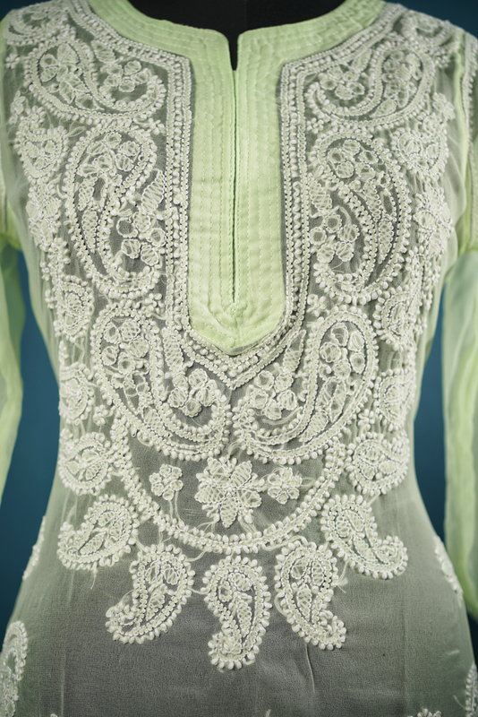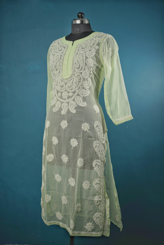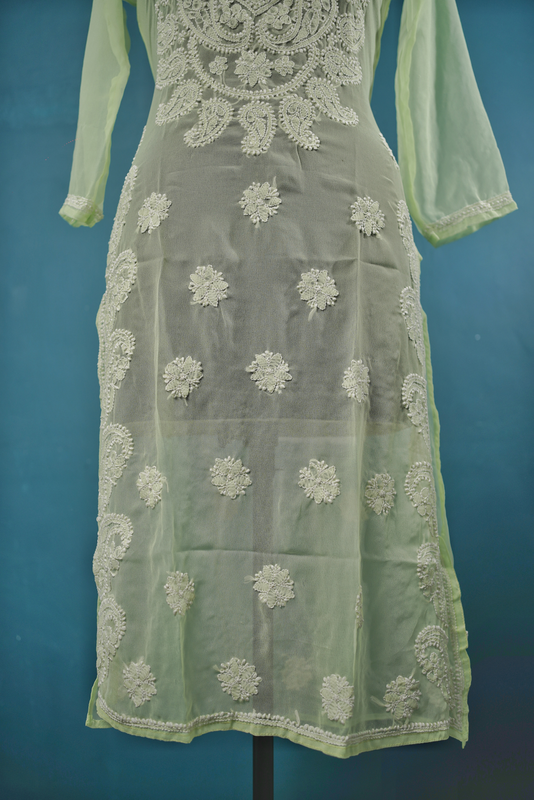 lucknowi chikankari hand embroidery light green georgette kurti for girls available in sizes-